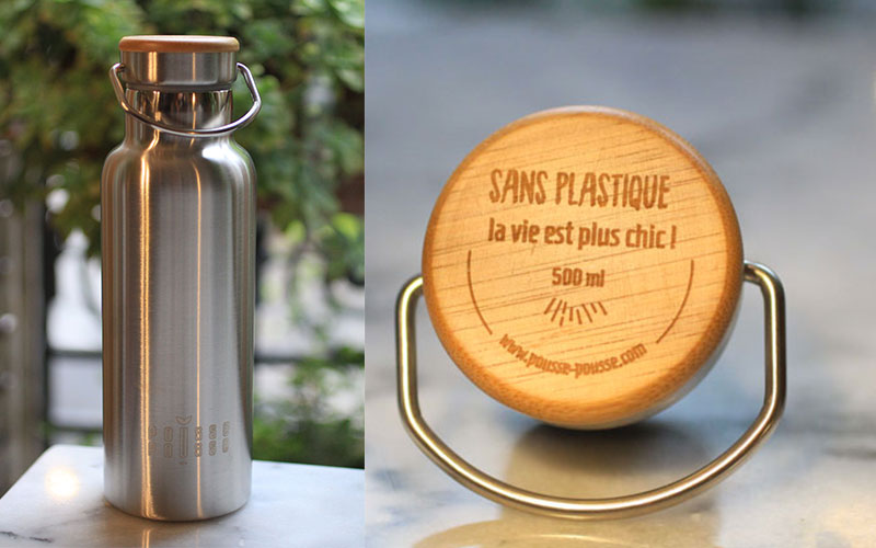 La box zéro déchet pousse pousse contient une gourde en inox avec un bouchon en bambou que je peux emporter partout.